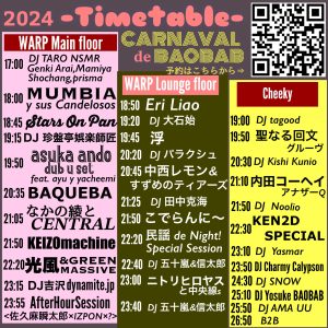DJ : 吉沢dynamite.jp / 珍盤亭 / 娯楽師匠 / 大石始 / Noolio / 田中克海(民謡クルセイダーズ) / TARO NSMR,Kishi Kunio,Yasmar,Genki Arai tagood,Daddy U,パラクシュ,Mamiya Shochang,prisma,Charmy☆Calypson,SNOW,鈴木信太郎,五十嵐,yosuke baobab